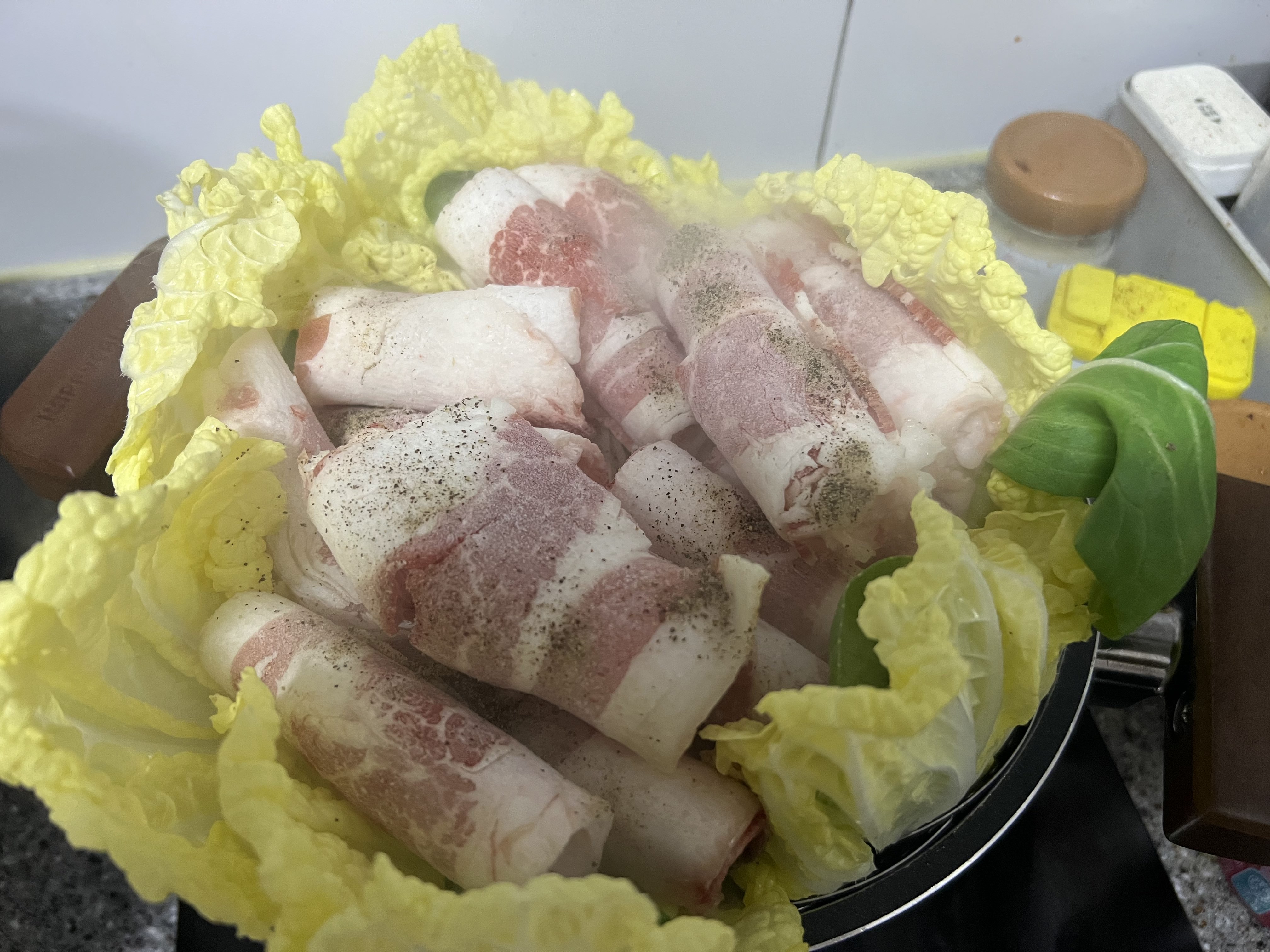 이 배추를 한장씩 뜯어서 씻고.. 찜기 맨 밑에 깔아줬어요
