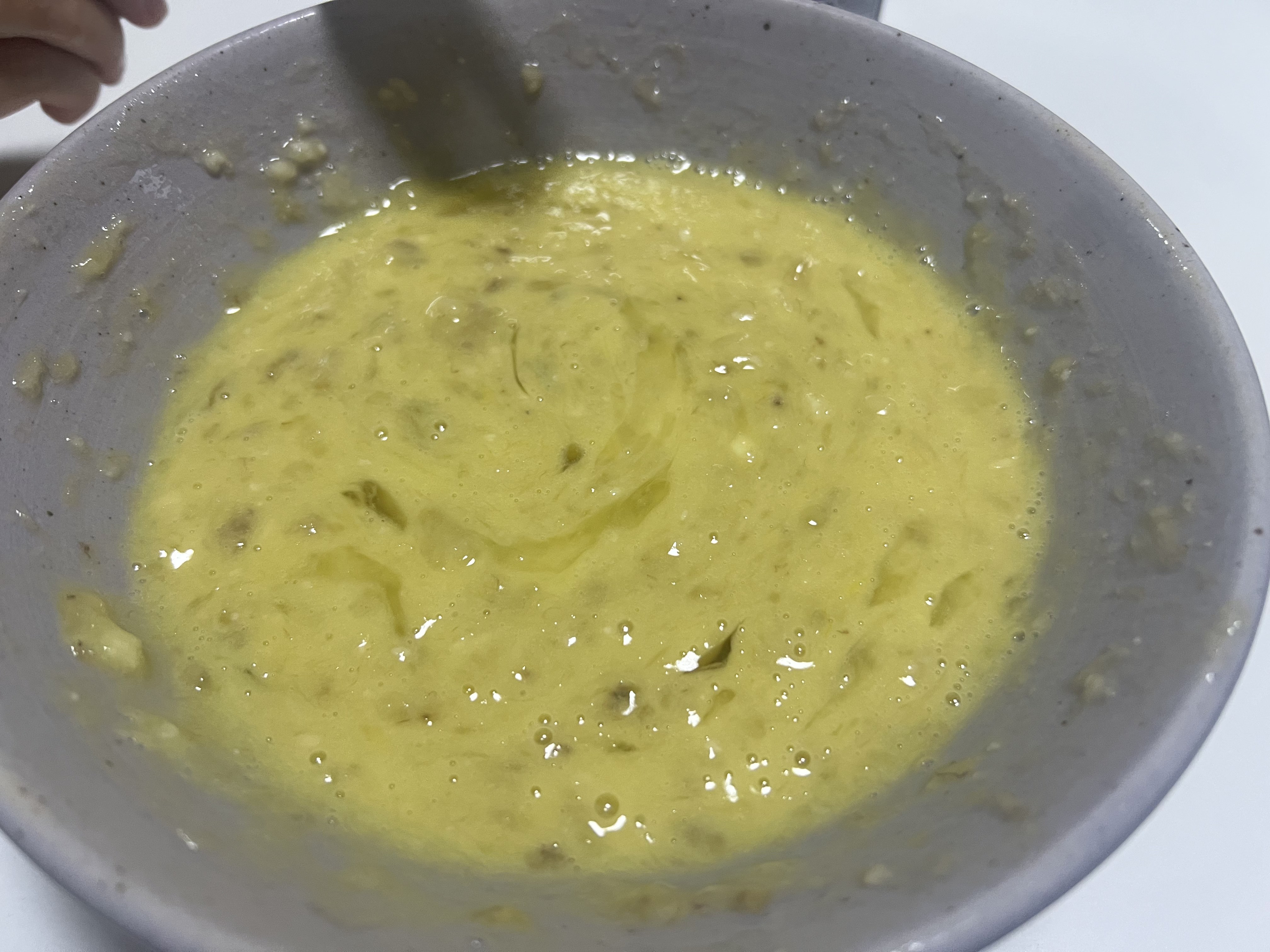 그 다음에는 포크로 으쌰으쌰 하면서 바나나를 으깨줘요!!