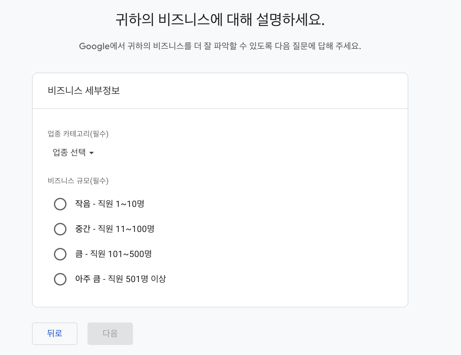 위에서 말씀드렸던 비즈니스 업종과 규모 선택하는게 나왔죠?